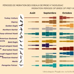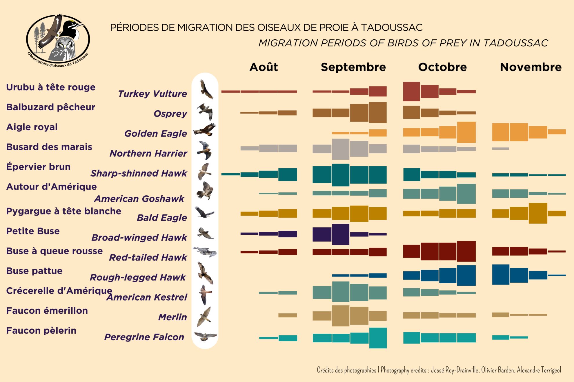 Migration dates vary according to the age of the individuals. For instance, the young Sharp-shinned Hawk, reach their migration peak around mid-September, while adults are observed around mid-October.