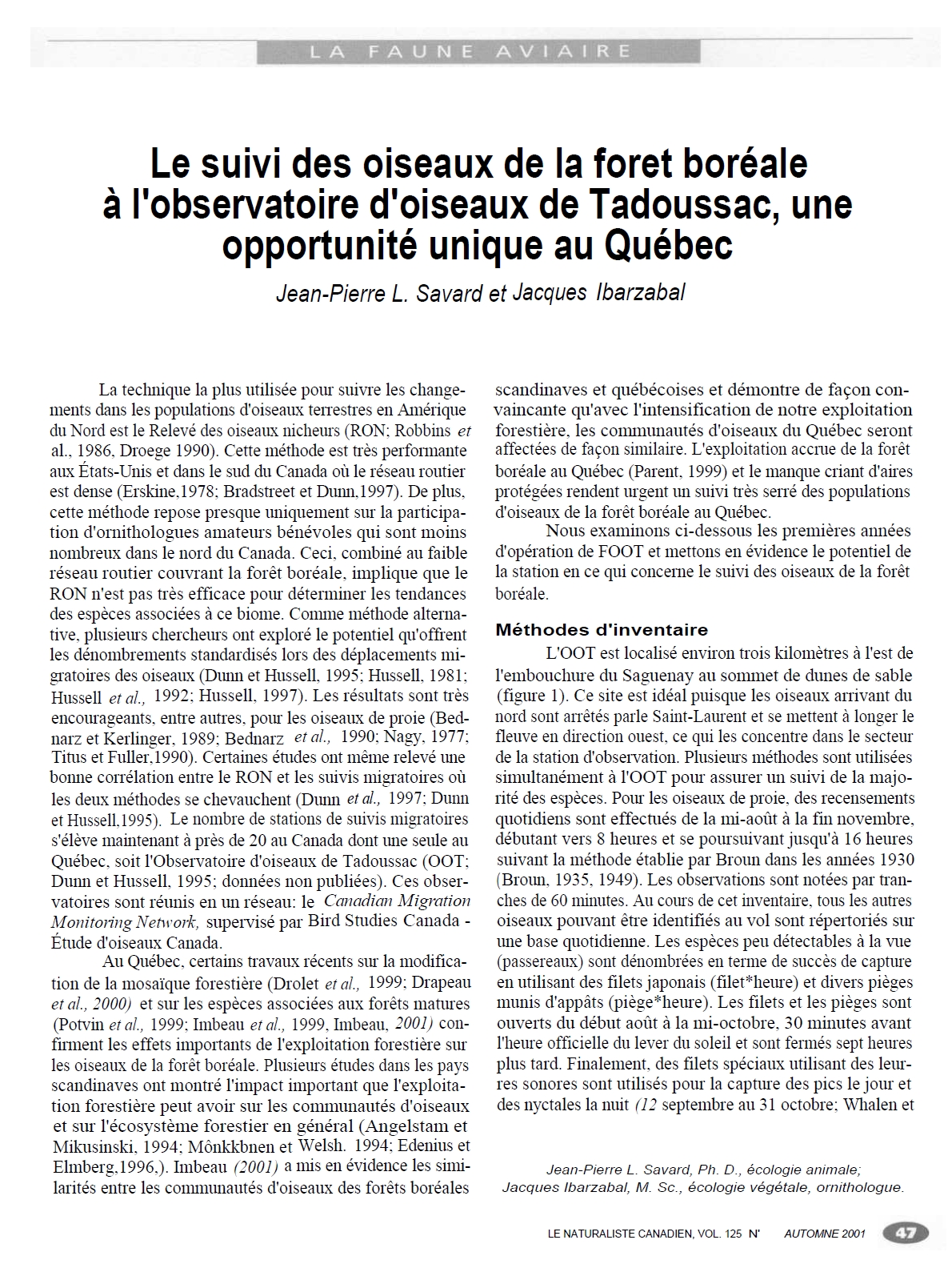 Dans le cas d’une production interne à l’OOT, les chercheurs/auteurs s’engagent à signaler dans toutes les productions faisant usage, en totalité ou en partie, de données ou d’informations provenant de l’OOT, l’ensemble des partenaires de l’OOT. La liste des partenaires sera établie en fonction des années associées aux données. Elle sera fournie par la direction de l’OOT et spécifiée dans l’Accord d’utilisation et de publication des données. Dans le cas d’une production externe à l’OOT, les chercheurs/auteurs s’engagent à signaler dans toutes les publications ou autres communications faisant usage, en totalité ou en partie de données ou d’informations provenant de l’OOT, la provenance de ces données ou de ces informations en indiquant la source de la manière suivante : « Observatoire d’oiseaux de Tadoussac (OOT), corporation Explos-Nature« .